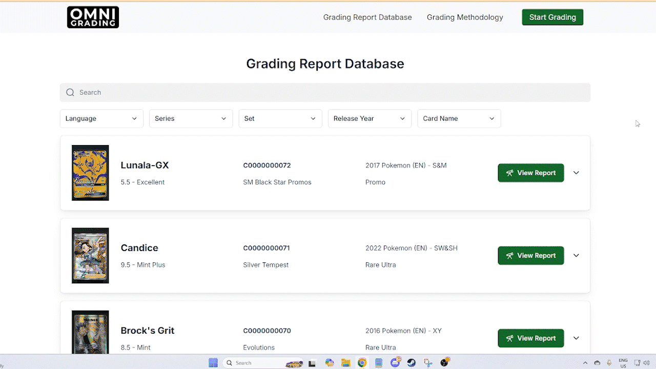 We provide a detailed report alongside every card that we grade - completely for free. Accessible by a QR code on each of our graded slabs, or through our public database at omnigradingreports.com you can access a full explanation for every grade and subgrade. We also include the high-resolution photos and stereoscopic imaging we used to grade your cards.